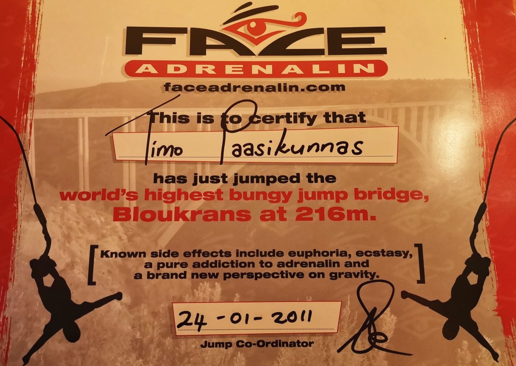 Hyppää vaikka benjihyppy jos siltä tuntuu. Voin sanoa että se on oikeasti syöksy sinne ihmeelliseen tunteeseen. Hyppäsin itse Etelä-Afrikassa, Bloukransin sillalta maailman korkeimman siltahypyn 216 metriä köydessä ja olen vieläkin, en vain hengissä vaan tälläkin hetkellä vielä täpinöissäni tästä!
