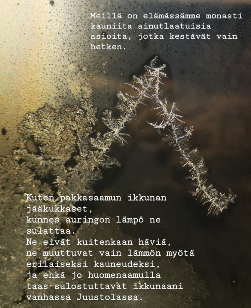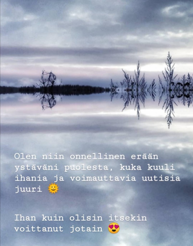 Tänään hän, kenestä kirjoitin aiemmassa blogikirjoituksessani, ihana ystäväni sai kuulla aivan upeita uutisia, joiden myötä sydämessäni läikähti lämmöstä, aivan kun olisin itse saavuttanut samalla jotain. Olen siis nii’iin onnellinen hänen puolestaan ja niistä mahdollisuuksista mitä hänelle nyt avautuu. Hän on tämän ansainnut.